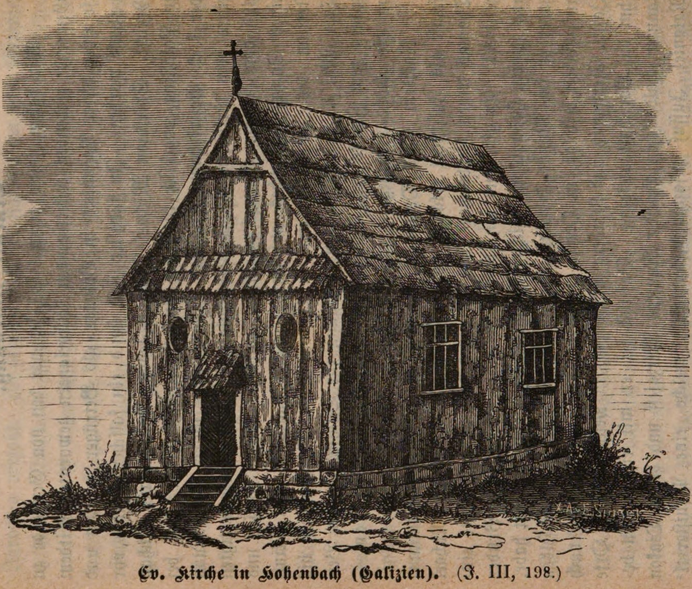 Ein seltenes Fest ist am 22. Oktober laufenden Jahres in Hohenbach gefeiert worden. Die neuerbaute Kirche ward eingeweiht und der Ortspfarrer Karl Johann Zipser als neugewählter Senior des westgalizischen Seniorates in sein Amt eingeführt. Viele Gäste, geistliche und weltliche, hatten sich meist schon tags zuvor von Nah und Fern eingefunden, um sich mit der Gemeinde des herrlichen Tages zu erfreuen. Am frühen Morgen wurden einige Chorale vom Turm von der aus dem nahen gelegenen Russland herübergekommenen Musikkapelle geblasen. Um 10 Uhr bewegte sich unter Vorantritt der anwesenden drei Pfarrer, eines ordinierten Schuldirektors, der drei galizischen Senioren und des galizisch- bukowinaer Superintendenten J. Hönel der Zug der Festgenossen zunächst in das alte, morsche Bethaus, um von demselben rührenden Abschied zu nehmen. Nachdem der 1. und 5. Vers des Liedes: „Kommt her, ihr Christen, voller Freud” gesungen wurde, trat Pfarrer Andreas Glajcar aus Drahomischel, welcher einst das Pfarramt von Reichsheim nach Hohenbach übertrug, an den Altar, um das Abschiedswort im alten Kirchlein zu sprechen. So manche aufrichtige Träne wurde dem Abschied vom alten lieben Gotteshaus gewidmet, das es sich ja der Gemeinde so manches Jahr in guten wie in bösen Tagen als der beste Freund bewiesen. Mit inniger Rührung und Wehmut stimmte nach vollendeter Rede und getanem Abschiedsgebet die Gemeinde den 3. Vers des Liedes „Nun Gottlob, es ist vollbracht” an, das letzte Lied, das im alten Gotteshause zur Ehre des Höchsten gesungen werden sollte.